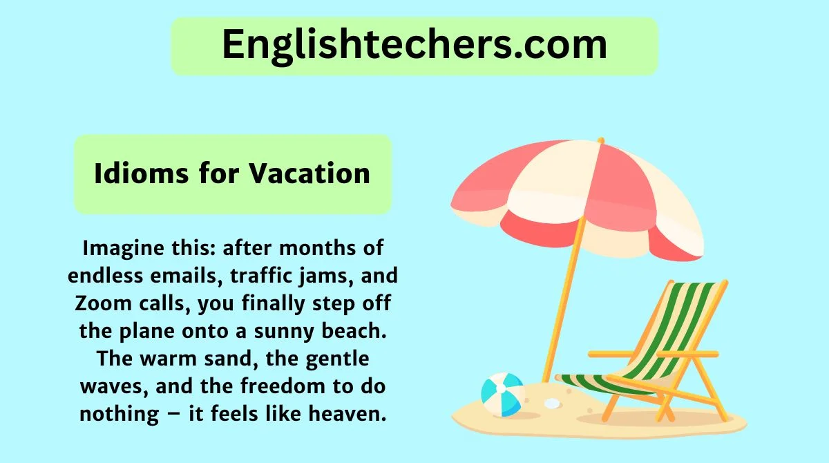 In this article, we’ll explore 19+ idioms for vacation, from funny expressions to literary gems. You’ll learn real-life examples, practice exercises, and tips to avoid common mistakes – making your English sound relaxed, natural, and travel-ready.